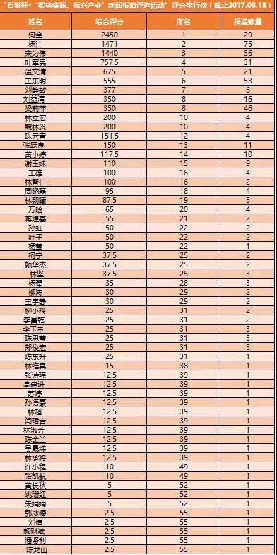 由石狮纺织服装产业联盟开展的“石狮杯·‘聚势集源、振兴产业’新闻报道评选活动”,截止至2017年8月15日,第四期新闻报道评选名单排行公布如下: