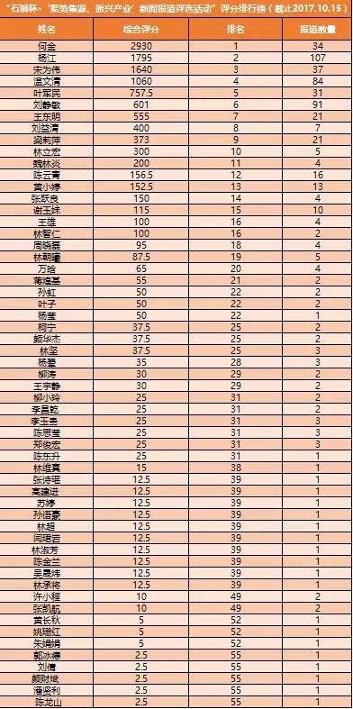 由石狮纺织服装产业联盟开展的“石狮杯·‘聚势集源、振兴产业’新闻报道评选活动”,截止至2017年10月15日,第六期新闻报道评选名单排行公布如下: