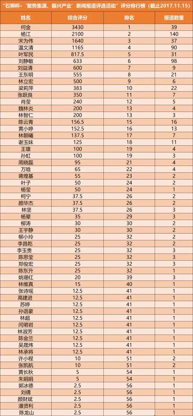 由石狮纺织服装产业联盟开展的“石狮杯·‘聚势集源、振兴产业’新闻报道评选活动”,截止至2017年11月15日,第七期新闻报道评选名单排行公布如下: