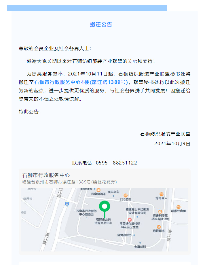石狮纺织服装产业联盟秘书处搬迁公告